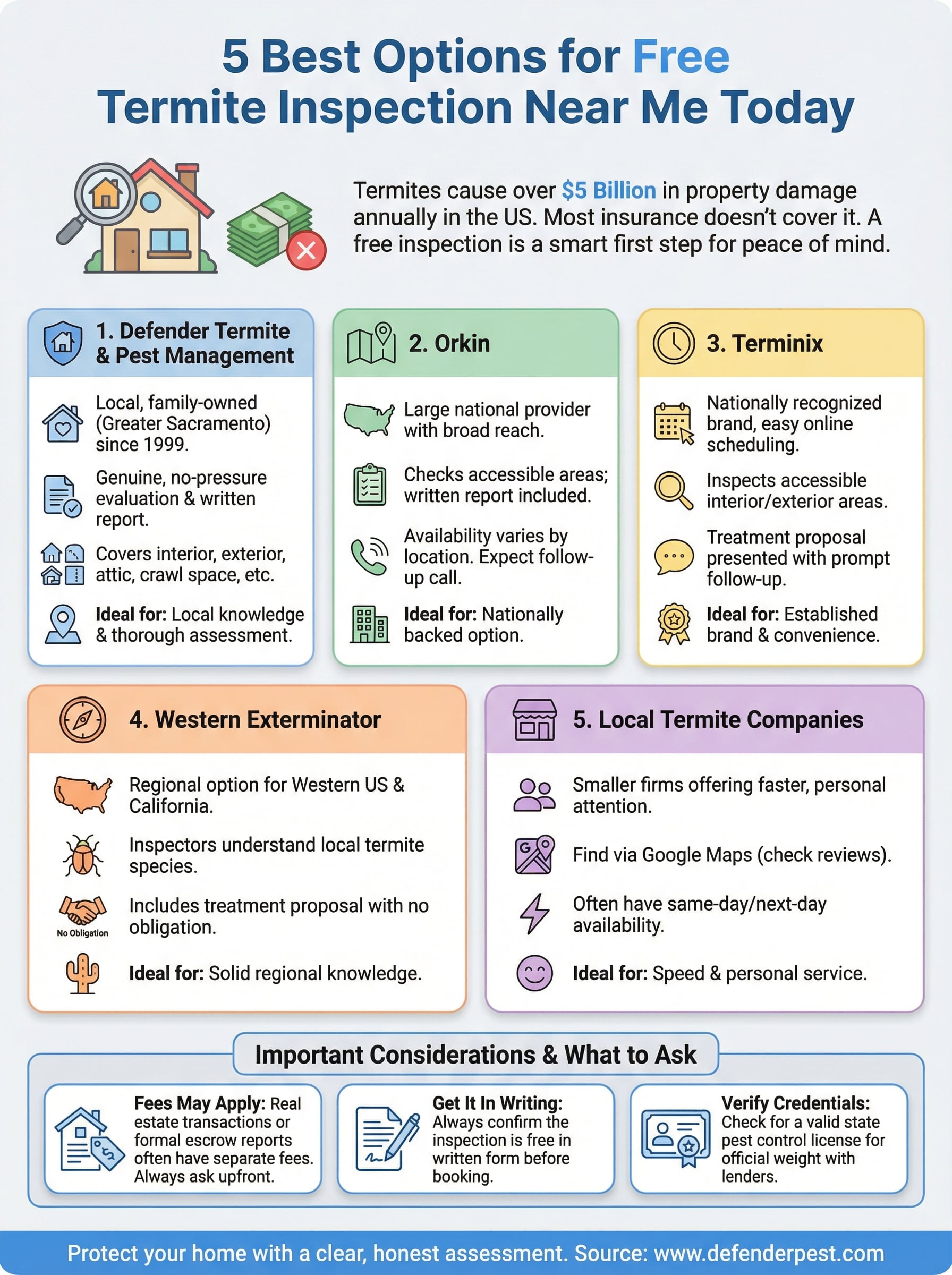 You now have five solid options for a free termite inspection near me , and each one comes with clear guidance on what to expect, what to ask, and when costs might apply. The right choice depends on your location, timeline, and how much follow-up contact you want after the visit .