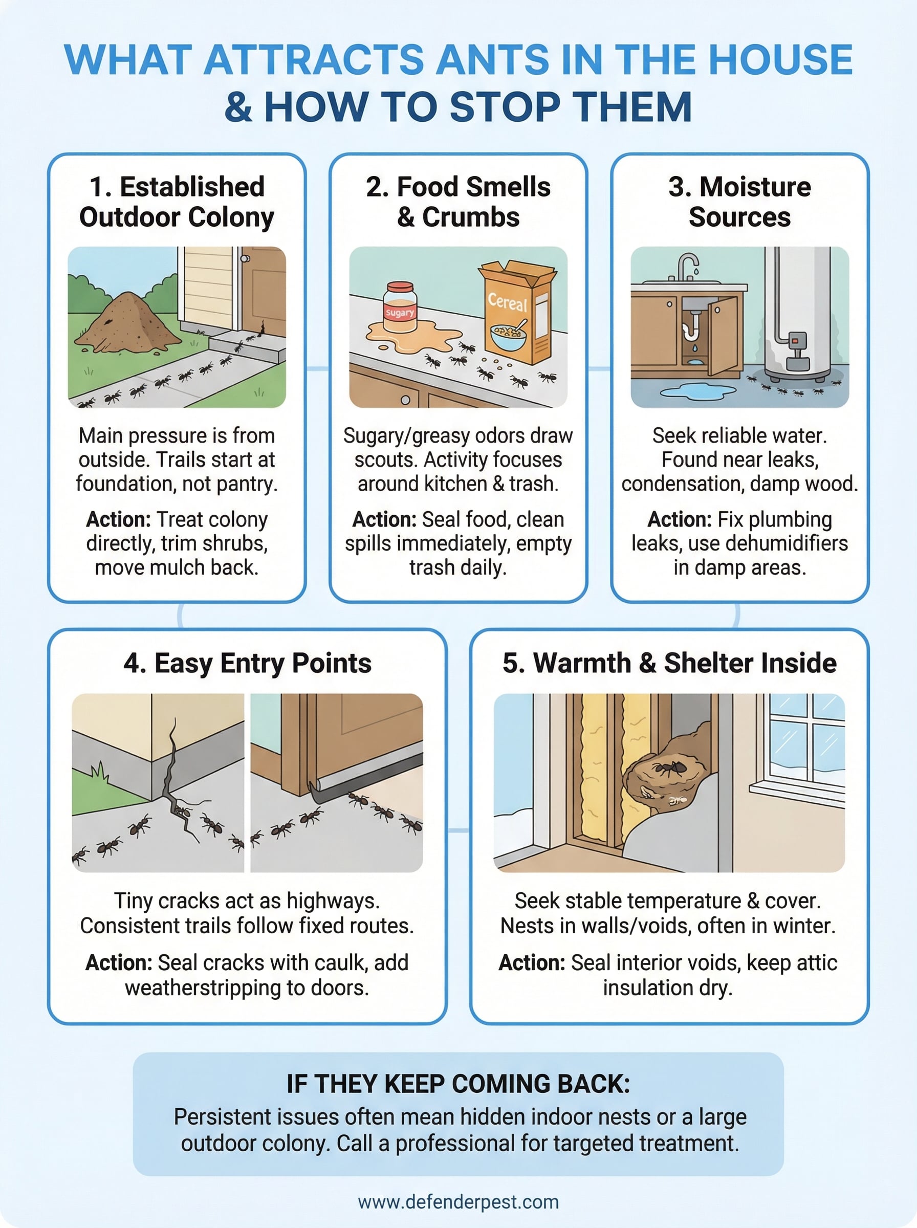 Below, we'll break down the five most common reasons ants find their way inside, along with practical steps you can take right now to make your home far less inviting. And if the problem has already gotten ahead of you, we'll cover when it's time to call a professional and what to expect from a targeted treatment plan .