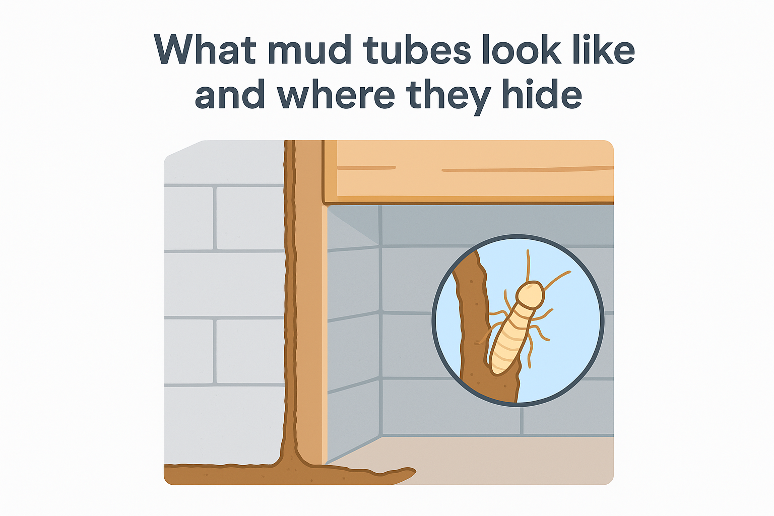 Subterranean termites build mud tubes to protect themselves while traveling between underground colonies and the wood they feed on. These pencil-width structures rank among the most reliable signs of termites in a home and appear most often along foundation walls, crawl space framing, and floor joists.