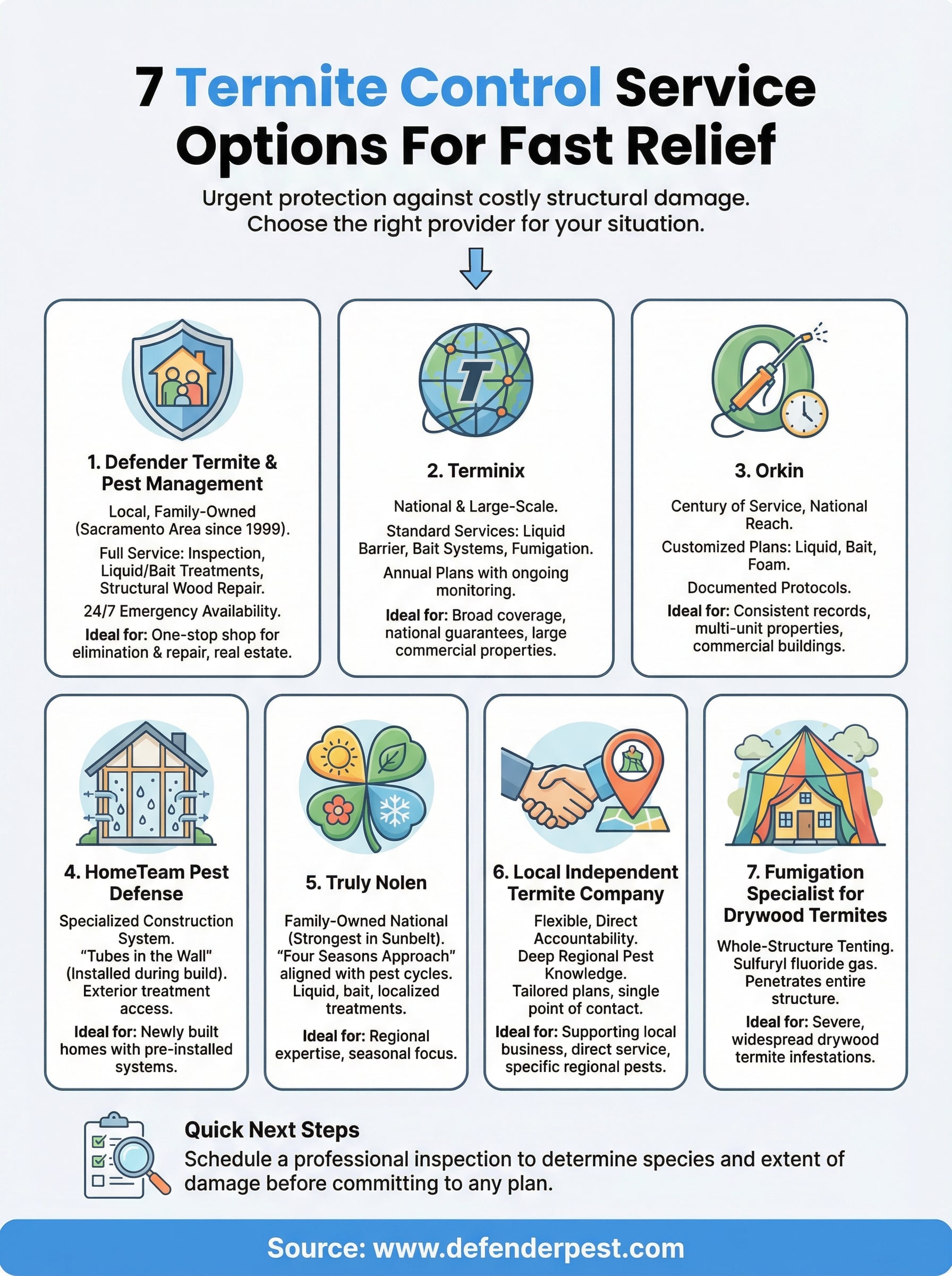 You now have a clear picture of seven termite control service near me options, what each one covers, and where each one fits your situation best. The right next move depends on what you're dealing with right now : a suspected infestation, an upcoming real estate transaction, or a routine inspection you've been putting off. Start by getting a professional inspection before committing to any treatment plan, since the termite species and extent of damage directly determine which method makes sense.