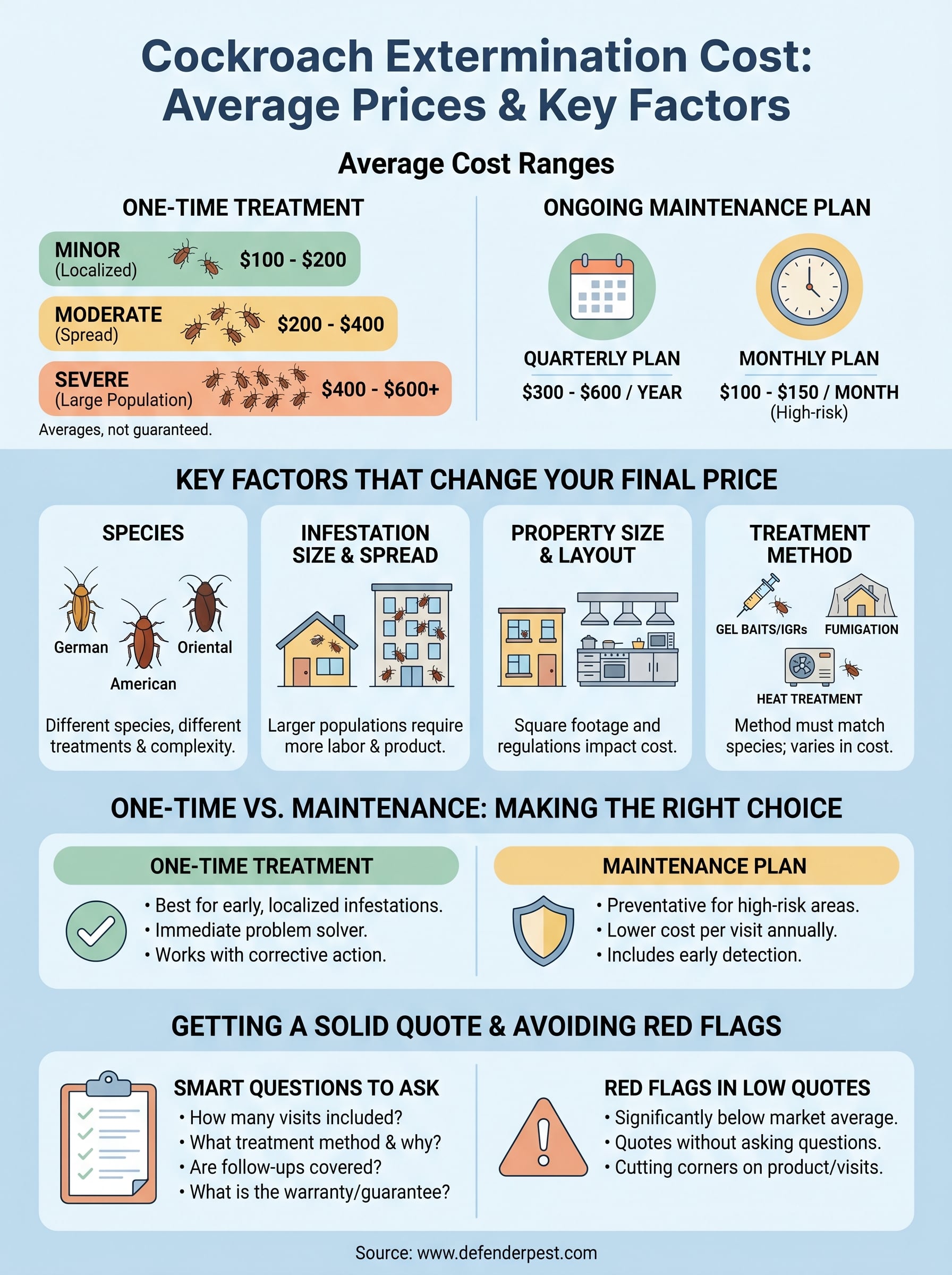 If you've spotted cockroaches in your home or business, the first question after the initial shock is usually about cockroach extermination cost . That's a fair place to start. Professional treatment prices vary widely, anywhere from $100 to $600 or more, and the final number depends on factors like the severity of the infestation , the species involved, the size of your property, and whether you need a one-time treatment or an ongoing plan.