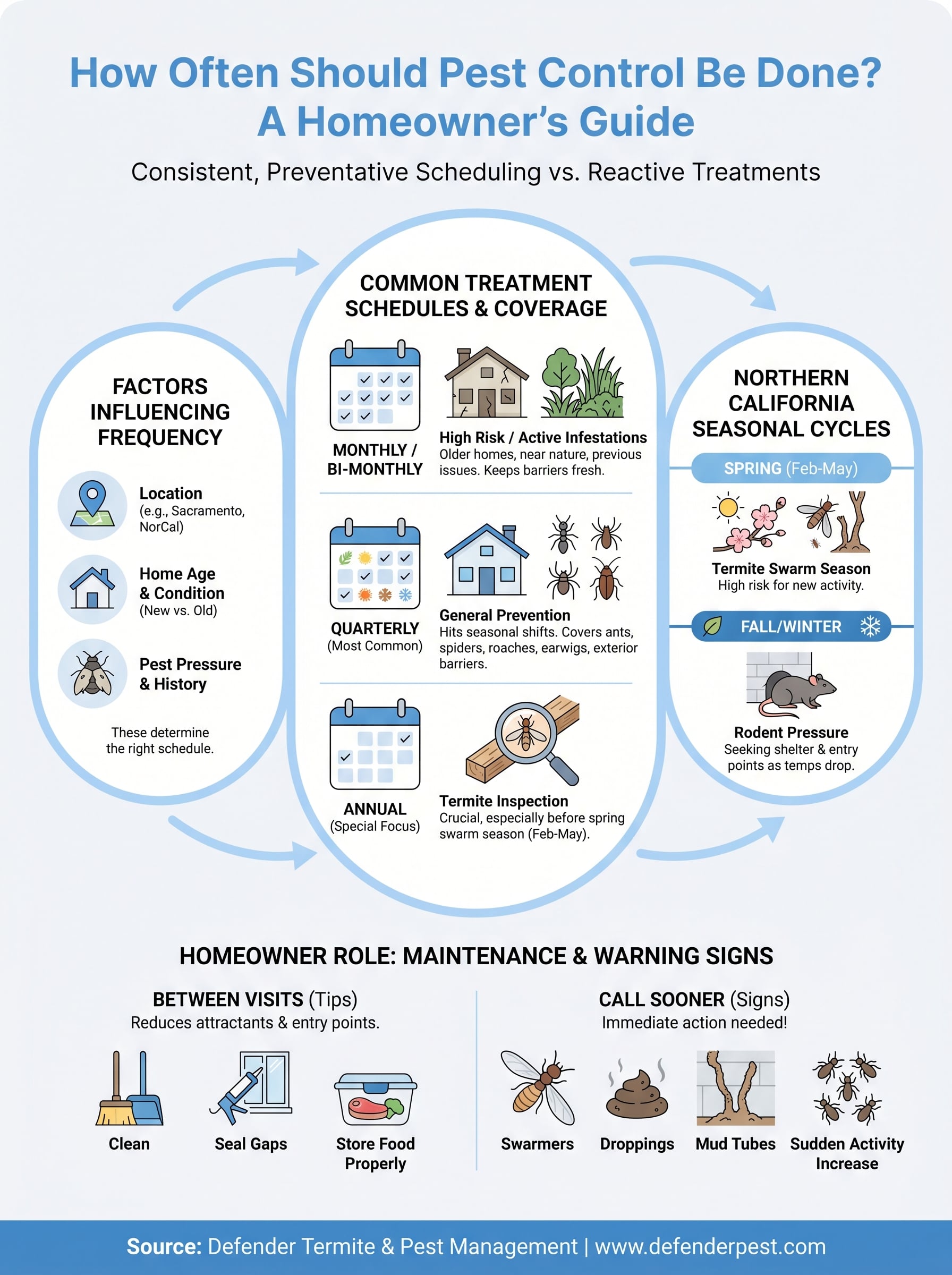 At Defender Termite & Pest Management, we've been helping Sacramento-area homeowners figure out exactly this since 1999. With over two decades of hands-on experience treating local homes and commercial properties, we know which pests show up, when they show up, and how frequently treatments need to happen to keep them out. This guide breaks down recommended pest control frequencies , what influences them, and how to decide what makes sense for your home.